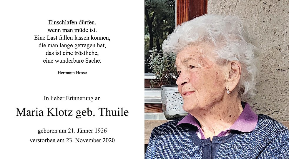Voll Dank für alle Liebe, die du uns in deinem Leben geschenkt hast, nehmen wir Abschied von unserer lieben Mama, Oma und Schwiegermutter, Frau