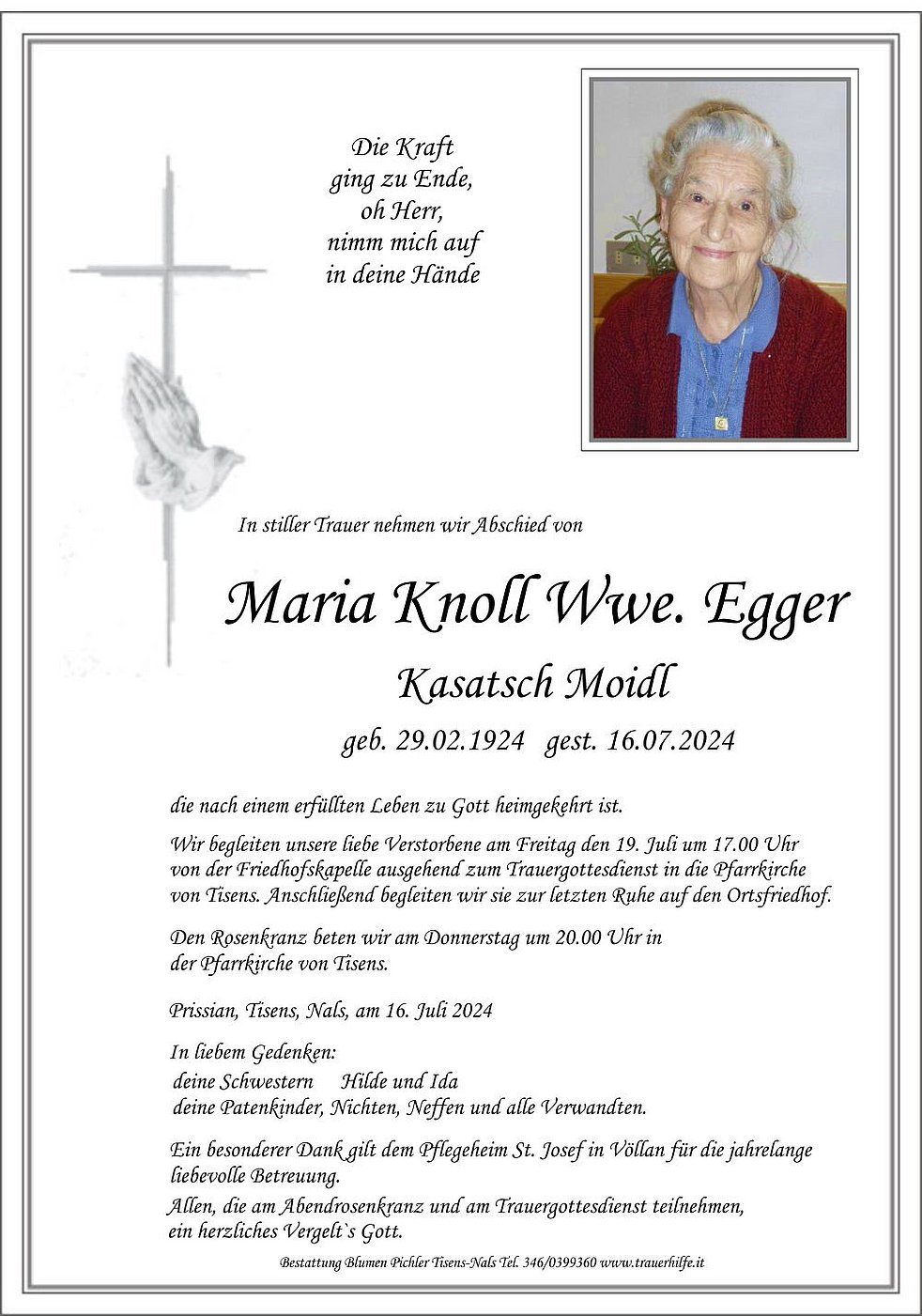 Begräbnisgottesdienst: 19.07. - 17:00 Uhr Pfarrkirche Tisens