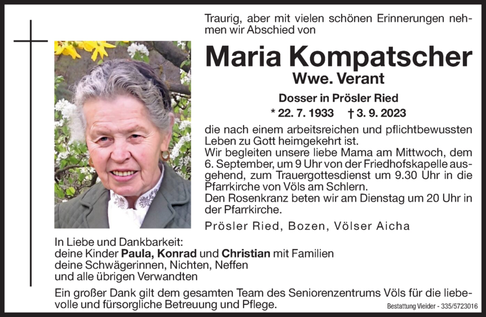Wir begleiten unsere liebe Mama am Mittwoch, 6. September um 9 Uhr von der Friedhofskapelle ausgehend, zum Trauergottesdienst um 9.30 Uhr in die Pfarrkirche von Völs am Schlern.