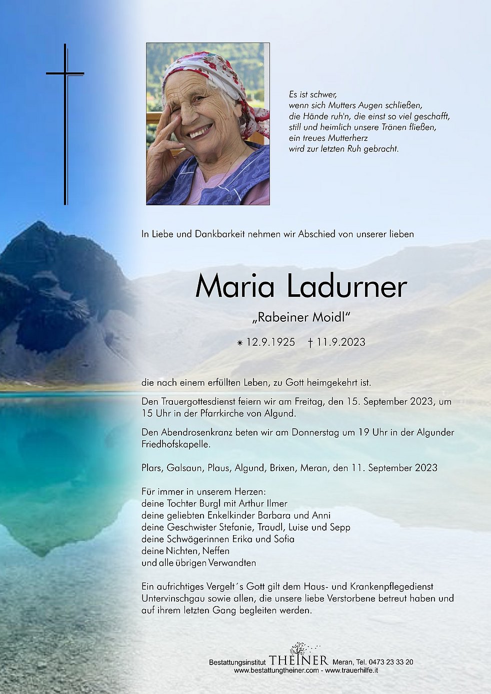 Den Trauergottesdienst feiern wir am Freitag, den 15. September 2023, um 15 Uhr in der Pfarrkirche von Algund.