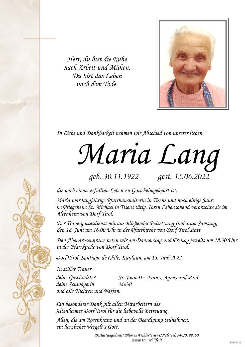 im Pflegeheim St. Michael in Tisens tätig. Ihren Lebensabend verbrachte sie im