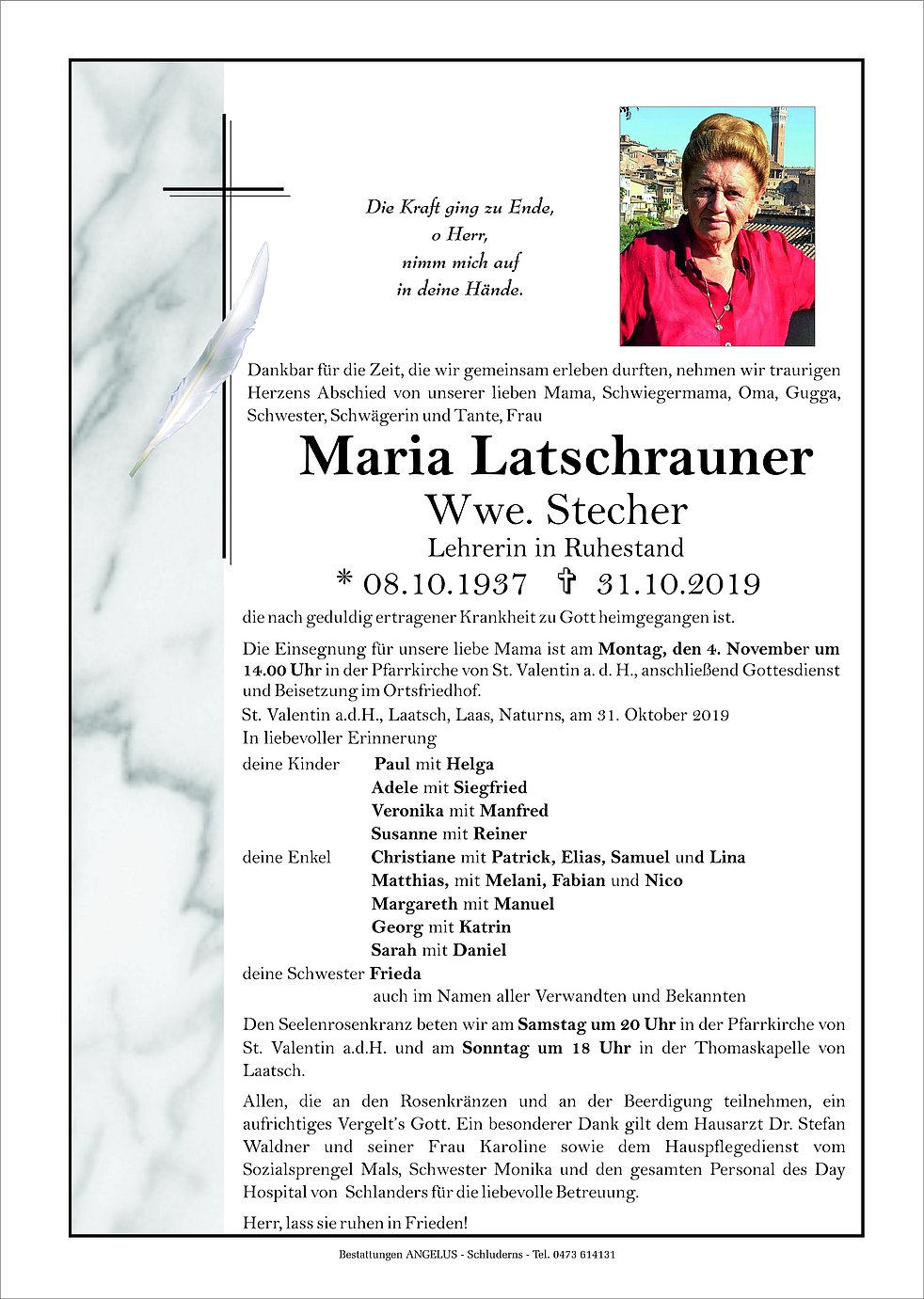 Allen, die an den Rosenkränzen und an der Beerdigung teilnehmen, ein aufrichtiges Vergelt’s Gott. Ein besonderer Dank gilt dem Hausarzt Dr. Stefan Waldner und seiner Frau Karoline sowie dem Hauspflegedienst vom Sozialsprengel Mals, Schwester Monika und dem gesamten Personal des Day Hospitals von Schlanders für die liebevolle Betreuung.