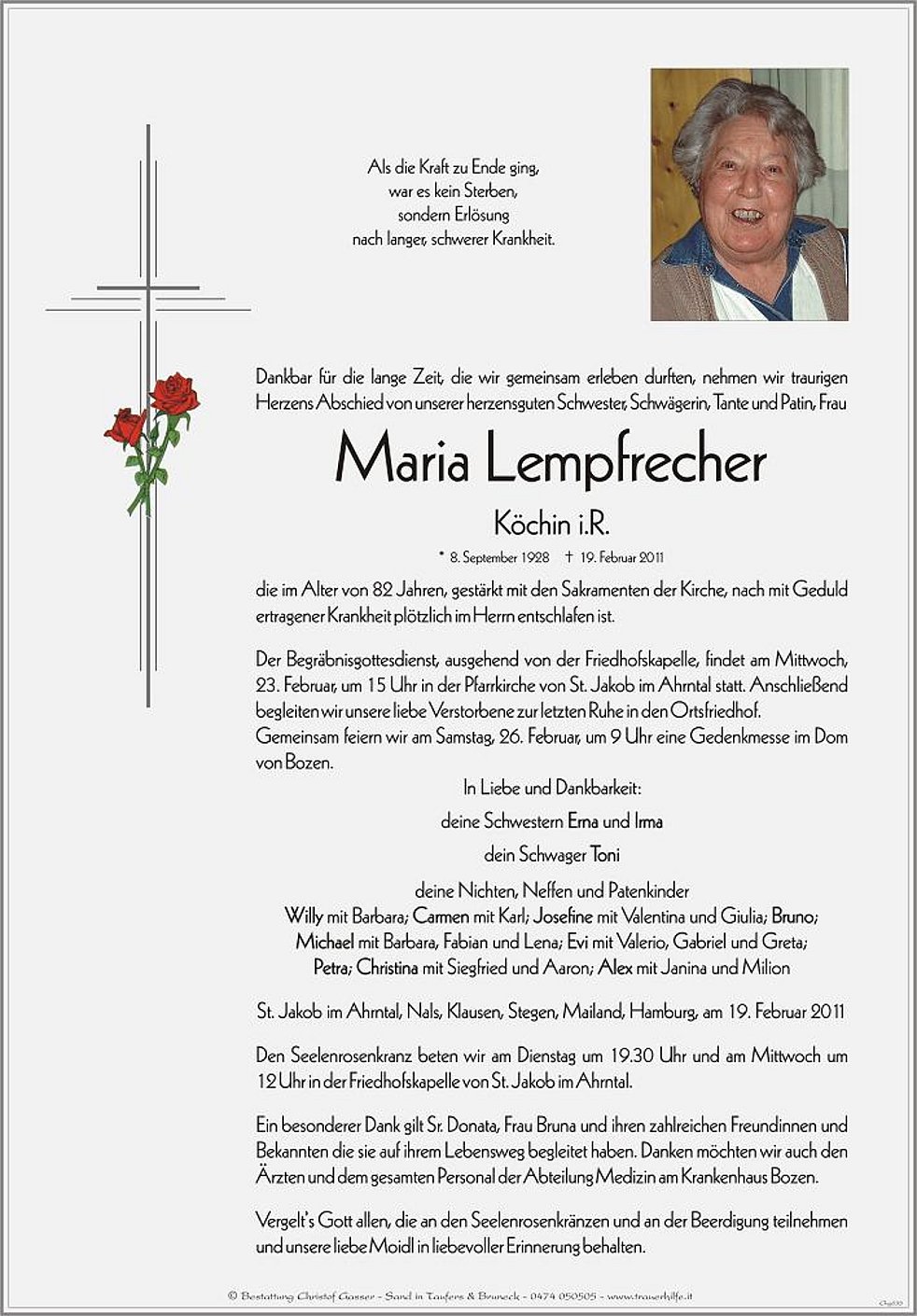 Der Begräbnisgottesdienst, ausgehend von der Friedhofskapelle, findet am Mittwoch, 23. Februar, um 15 Uhr in der Pfarrkirche von St. Jakob im Ahrntal statt. Anschließend begleiten wir unsere liebe Verstorbene zur letzten Ruhe in den Ortsfriedhof.