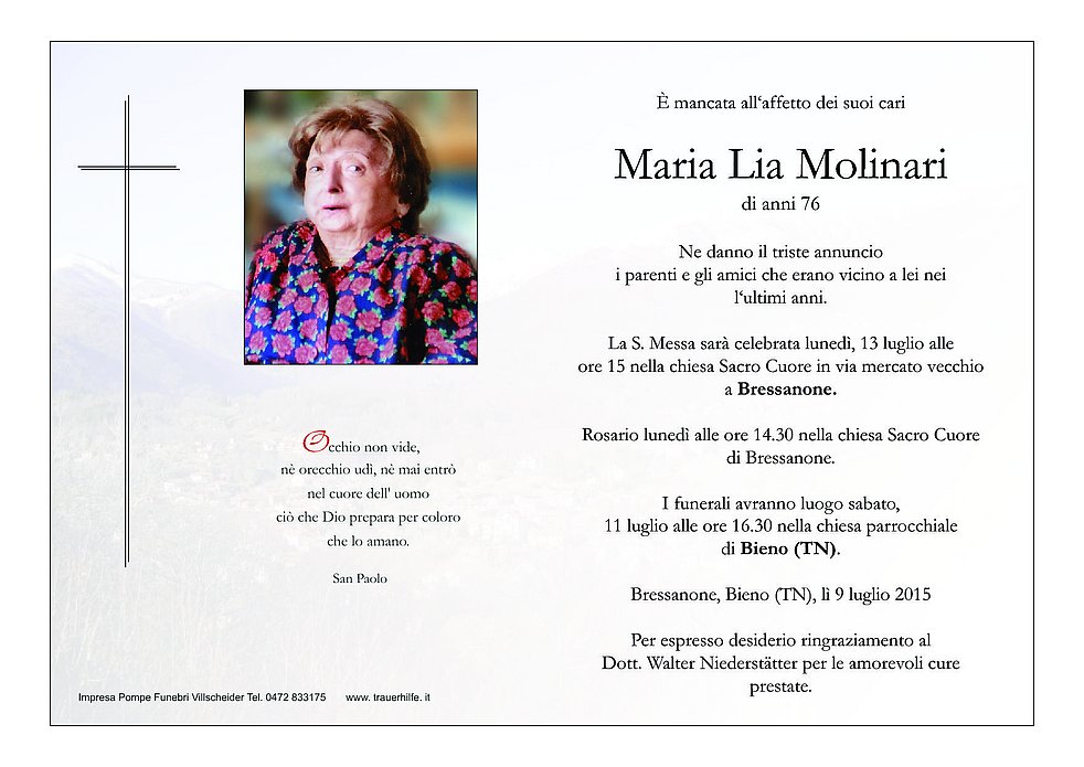 Bressanone, Bieno (TN), lì 9 luglio 2015