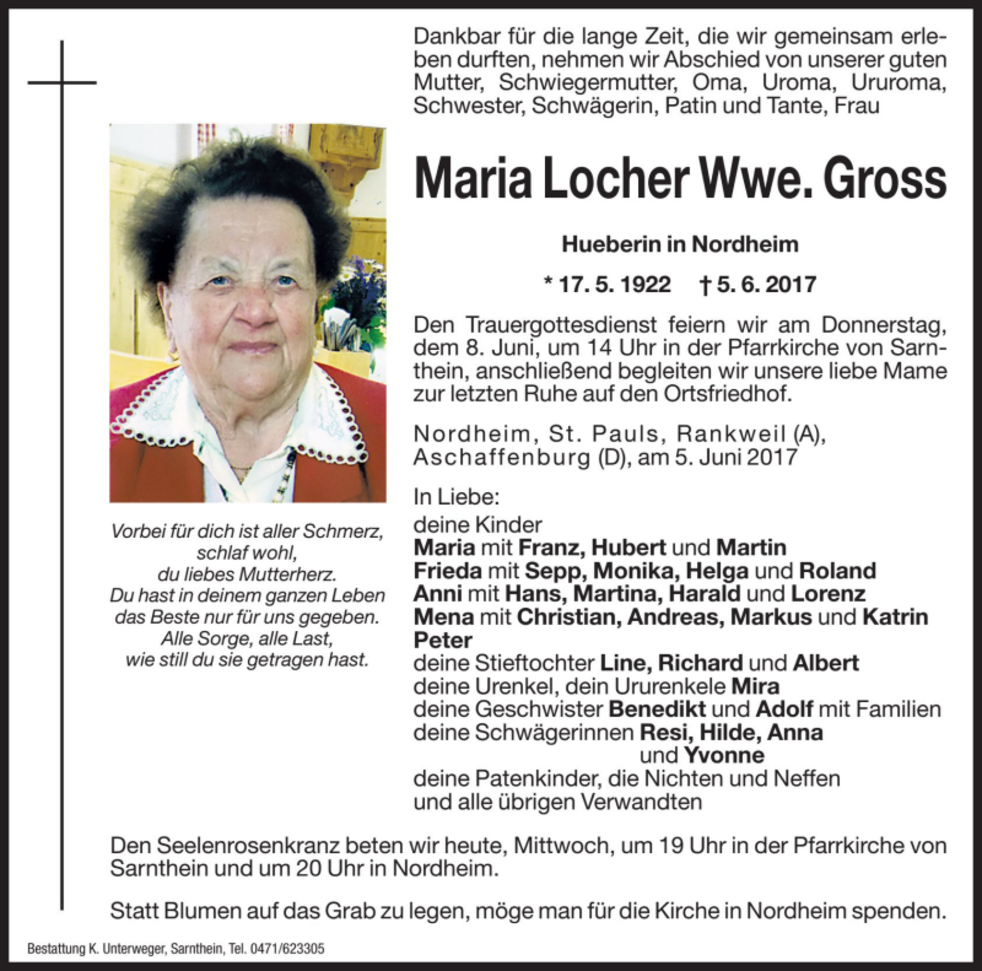 Den Trauergottesdienst feiern wir am Donnerstag , dem 8. Juni um 14 Uhr in der Pfarrkirche von Sarnthein, anschließend begleiten wir unsere liebe Mame zur letzten Ruhe auf den Ortsfriedhof.