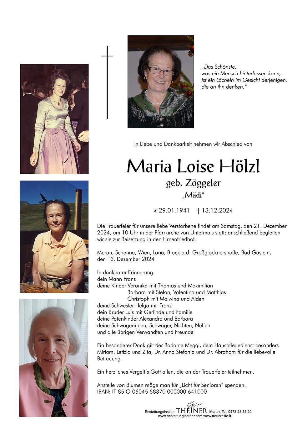 Die Trauerfeier für unsere liebe Verstorbene findet am Samstag, den 21. Dezember 2024, um 10 Uhr in der Pfarrkirche von Untermais statt; anschließend begleiten wir sie zur Beisetzung in den Urnenfriedhof.