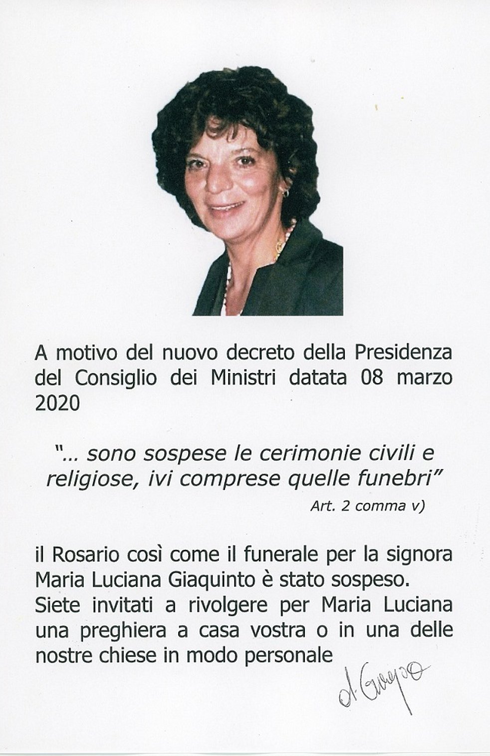 Il Rosario cosí come il funerale per la signora Maria Luciana Giaquinto é stato sospeso. Siete invitati a rivolgere per Maria Luciana una preghiera a casa vostra o in una delle nostre chiese in modo personale.