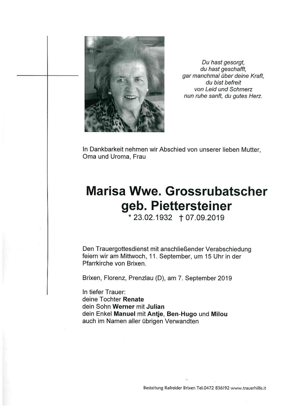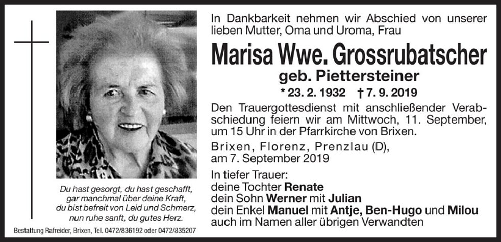 Den Trauergottesdienst mit anschließender Verabschiedung feiern wir am Mittwoch, 11. September, um 15 Uhr in der Pfarrkirche von Brixen.