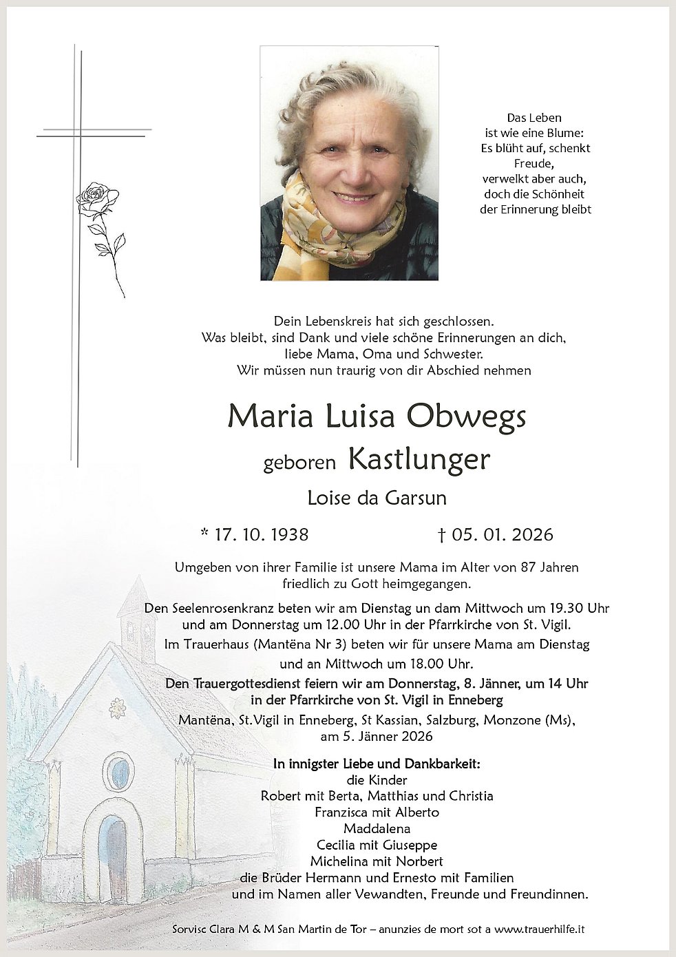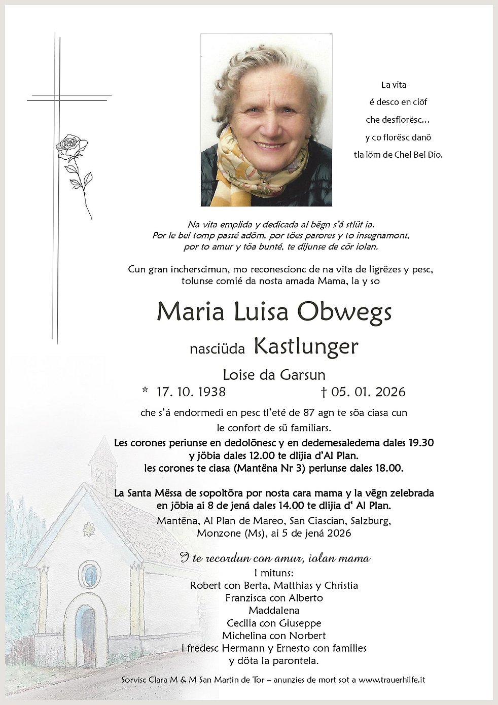 Liebe Familie Obwegs mit großer Betroffenheit habe ich von den Verlust von Louise erfahren.Ich möchte Euch mein tiefes Beileid aussprechen und meine Gedanken senden.Loise war immer für andere da-hilfsbereit,warmherzig und voller Lebensfreude.Ihre Unterstützung hat vielen,und auch mir und Sandra,so viel bedeutet.Ich werde Ihr großes Herz immer in Erinnerung behalten. Eine innige Umarmung ! Maria Demichiel mit Fam.