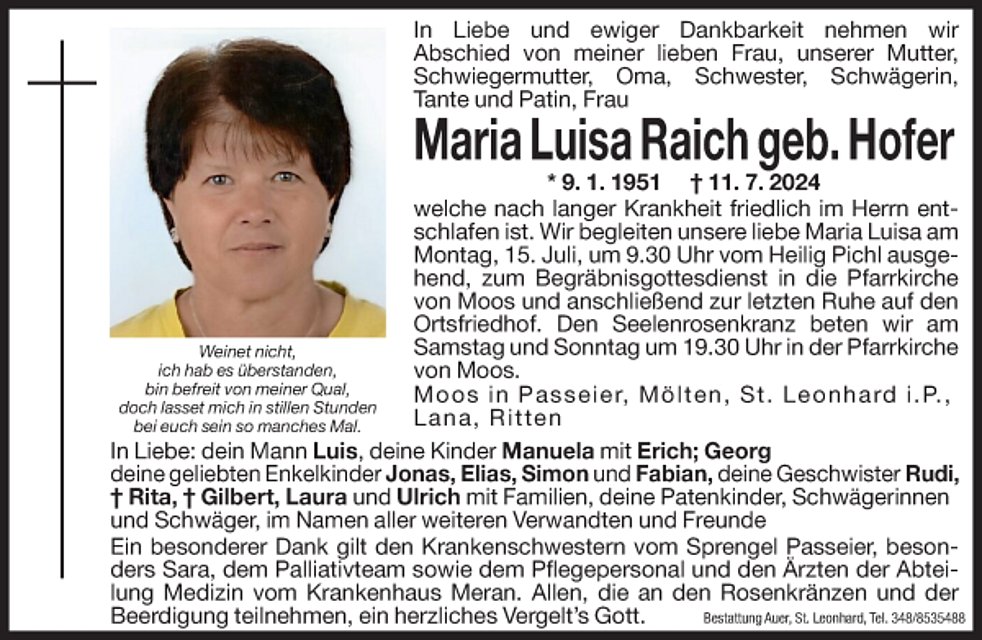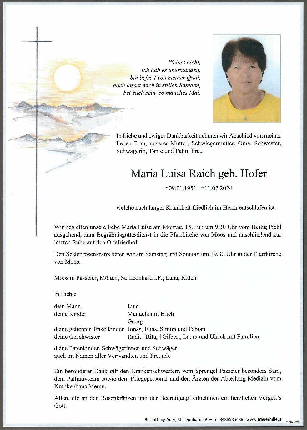 Wir begleiten unsere liebe Maria Luisa am Montag, 15. Juli um 9.30 Uhr vom Heilig Pichl ausgehend, zum Begräbnisgottesdienst in die Pfarrkirche von Moos und anschließend zur letzten Ruhe auf den Ortsfriedhof.