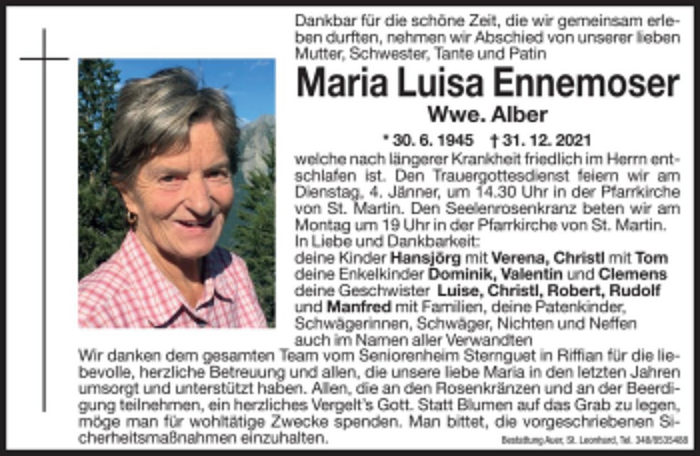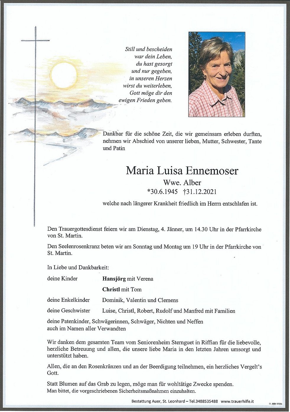 Den Trauergottesdienst feiern wir am Dienstag, 4. Jänner, um 14.30 Uhr in der Pfarrkirche von St. Martin.