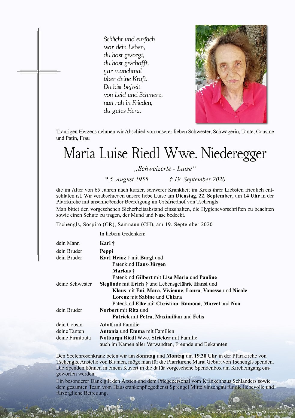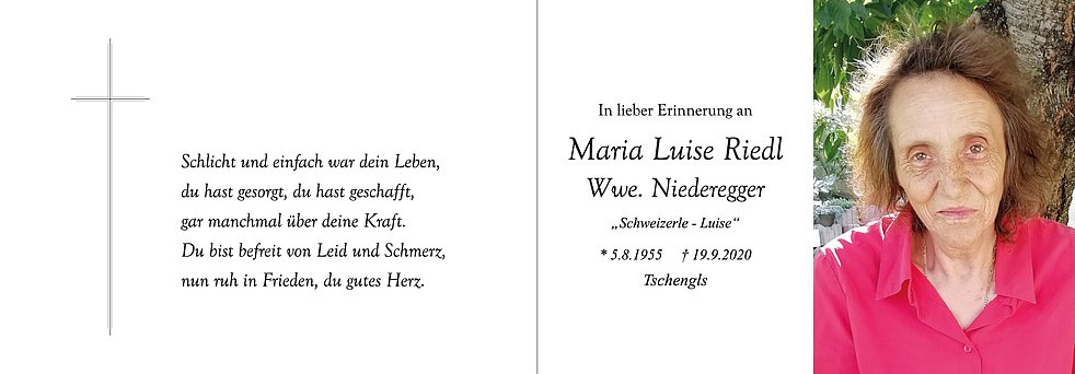 Wir verabschieden unsere liebe Luise am Dienstag, 22. September, um 14 Uhr in der Pfarrkirche mit anschließender Beerdigung im Ortsfriedhof von Tschengls.