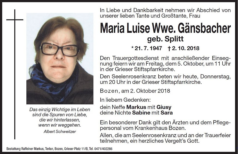 Den Trauergottesdienst mit anschließender Einsegnung feiern wir am Freitag, dem 5. Oktober, um 11 Uhr in der Grieser Stiftspfarrkirche.