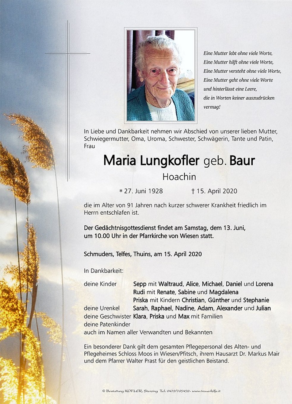 Ein besonderer Dank gilt dem gesamten Pflegepersonal des Alten- und Pflegeheimes Schloss Moos in Wiesen/Pfitsch, ihrem Hausarzt Dr. Markus Mair und dem Pfarrer Walter Prast für den geistlichen Beistand.
