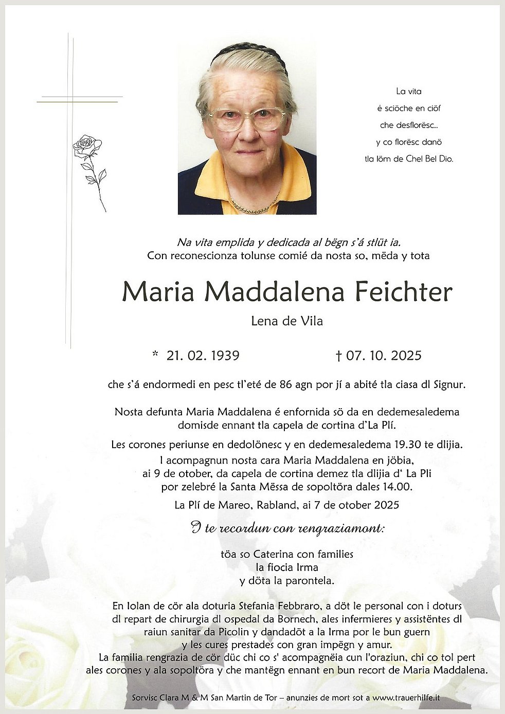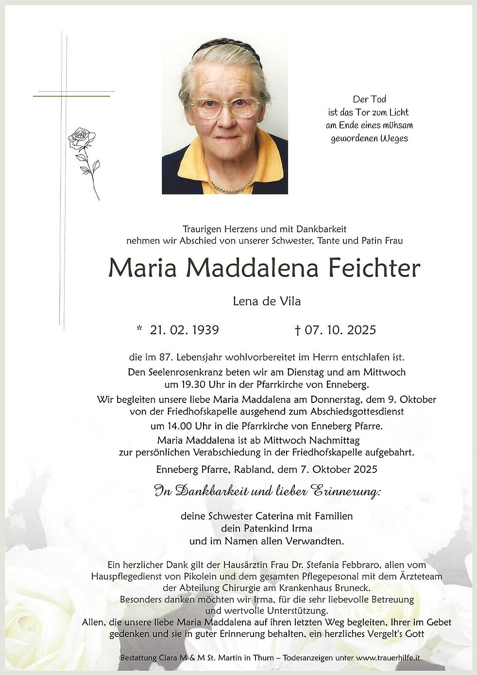 Begräbnisgottesdienst: 09.10. - 14:00 Uhr Enneberg Pfarre