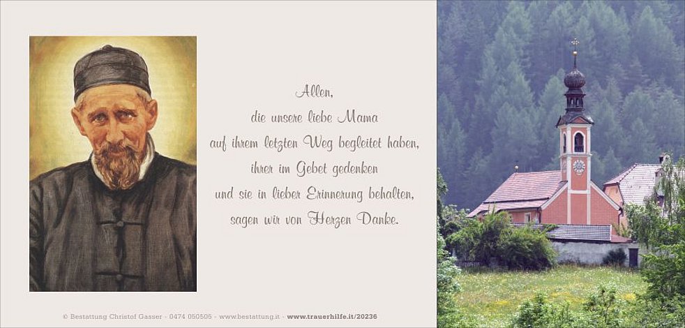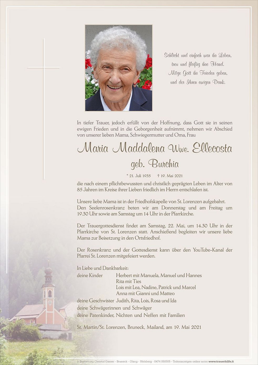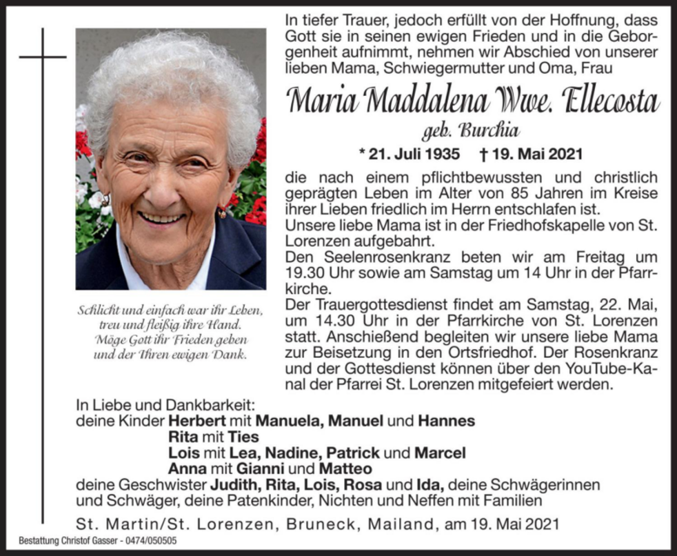 Der Trauergottesdienst findet am Samstag, 22. Mai, um 14.30 Uhr in der Pfarrkirche von St. Lorenzen statt. Anschießend begleiten wir unsere liebe Mama zur Beisetzung in den Ortsfriedhof.