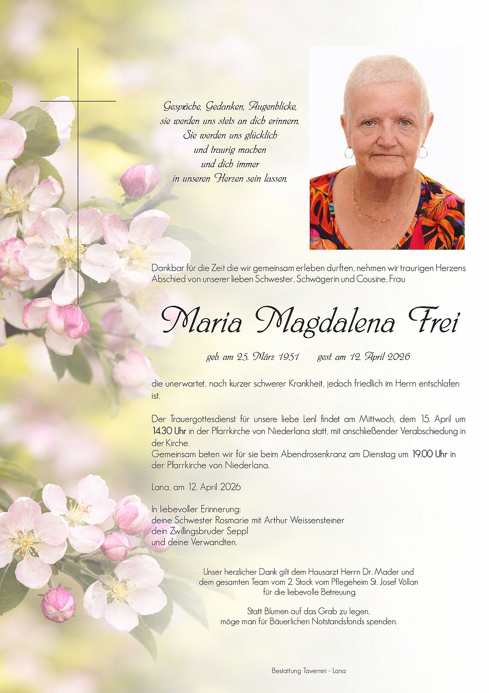 Emma Malfertheiner Völs am Schlern habe das selbe Geburtsdatum wie die Verstorbene Frau Maria Magdalena.