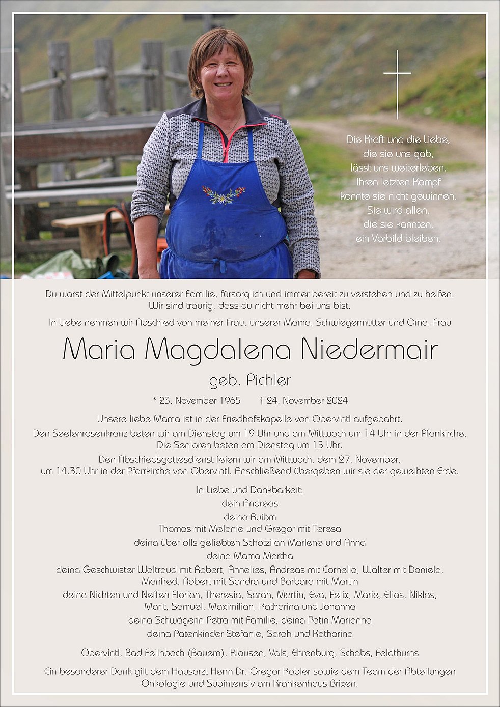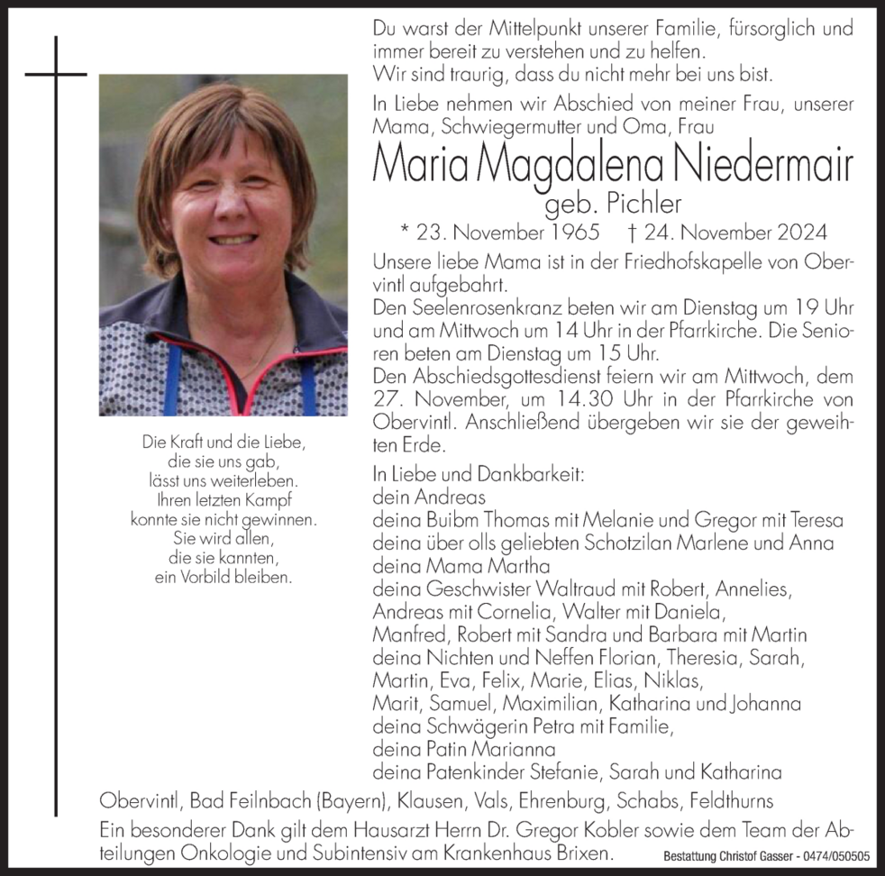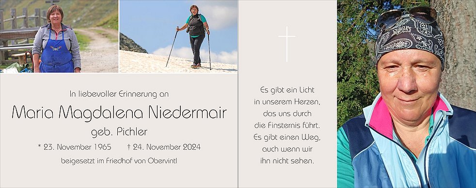um 14.30 Uhr in der Pfarrkirche von Obervintl. Anschließend übergeben wir sie der geweihten Erde.