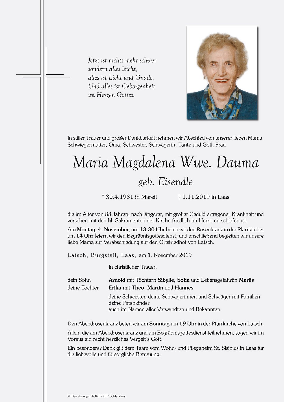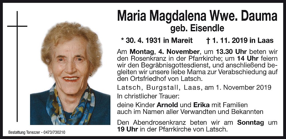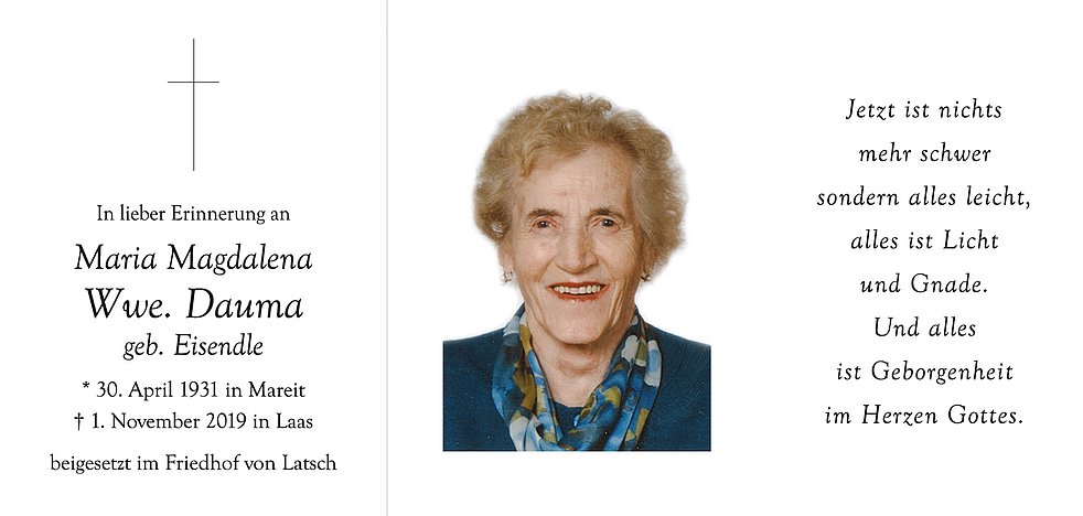 um 14 Uhr feiern wir den Begräbnisgottesdienst, und anschließend begleiten wir unsere liebe Mama zur Verabschiedung auf den Ortsfriedhof von Latsch.