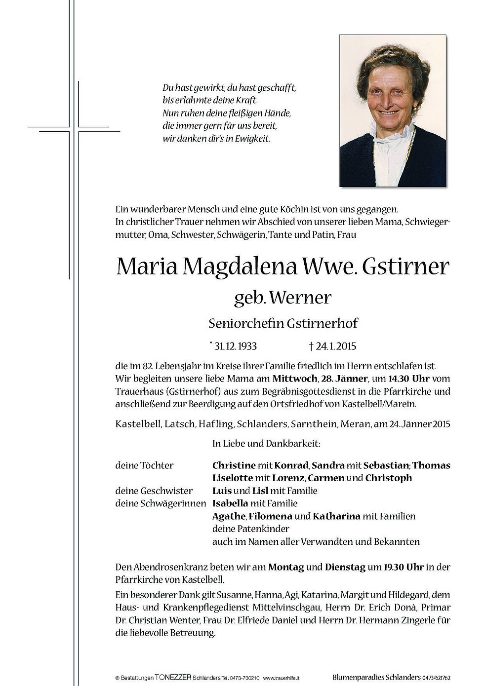 Wir begleiten unsere liebe Mama am Mittwoch, 28. Jänner, um 14.30 Uhr vom Trauerhaus (Gstirnerhof) aus zum Begräbnisgottesdienst in die Pfarrkirche und anschließend zur Beerdigung auf den Ortsfriedhof von Kastelbell/Marein.