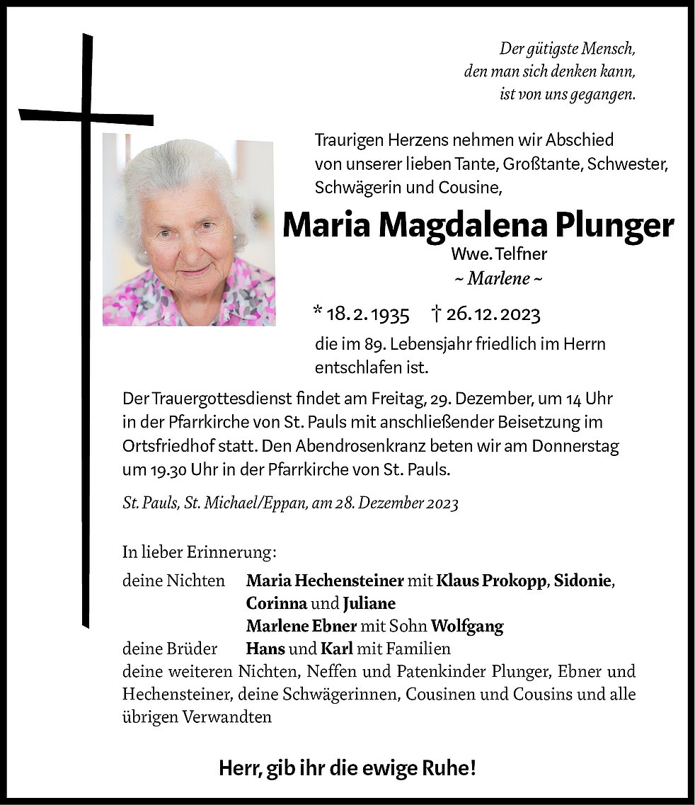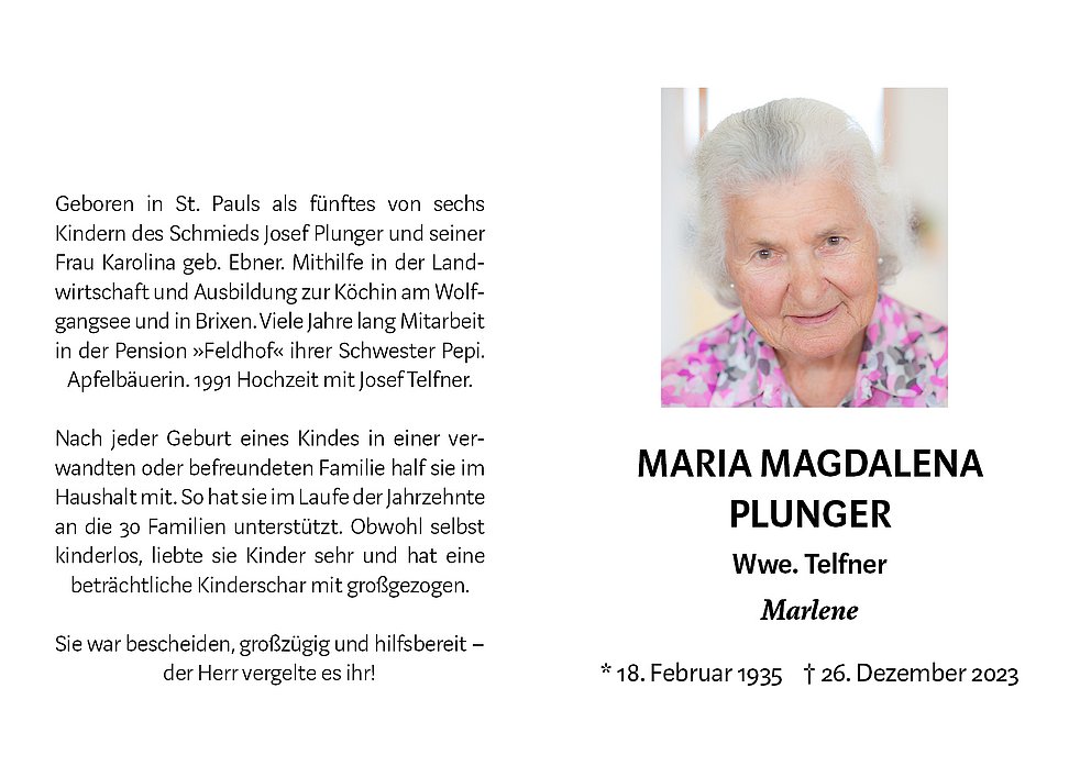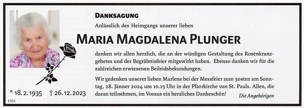 Der Trauergottesdienst findet am Freitag, 29. Dezember, um 14 Uhr in der Pfarrkirche von St. Pauls mit anschließender Beisetzung im Ortsfriedhof statt.