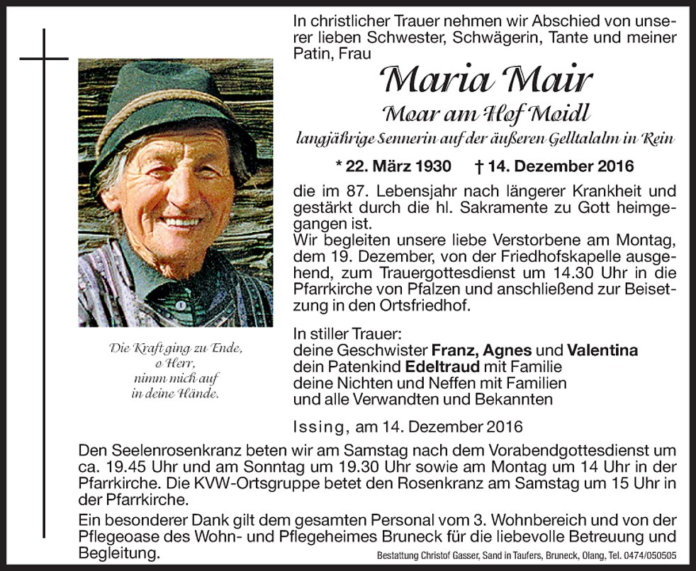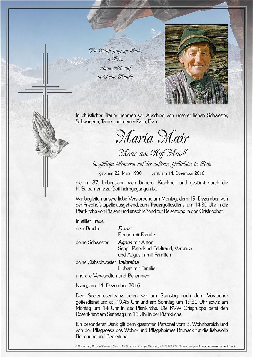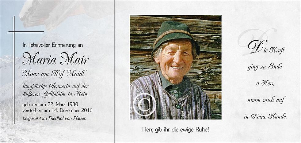 Wir begleiten unsere liebe Verstorbene am Montag, dem 19. Dezember, von der Friedhofskapelle ausgehend, zum Trauergottesdienst um 14.30 Uhr in die Pfarrkirche von Pfalzen und anschließend zur Beisetzung in den Ortsfriedhof.