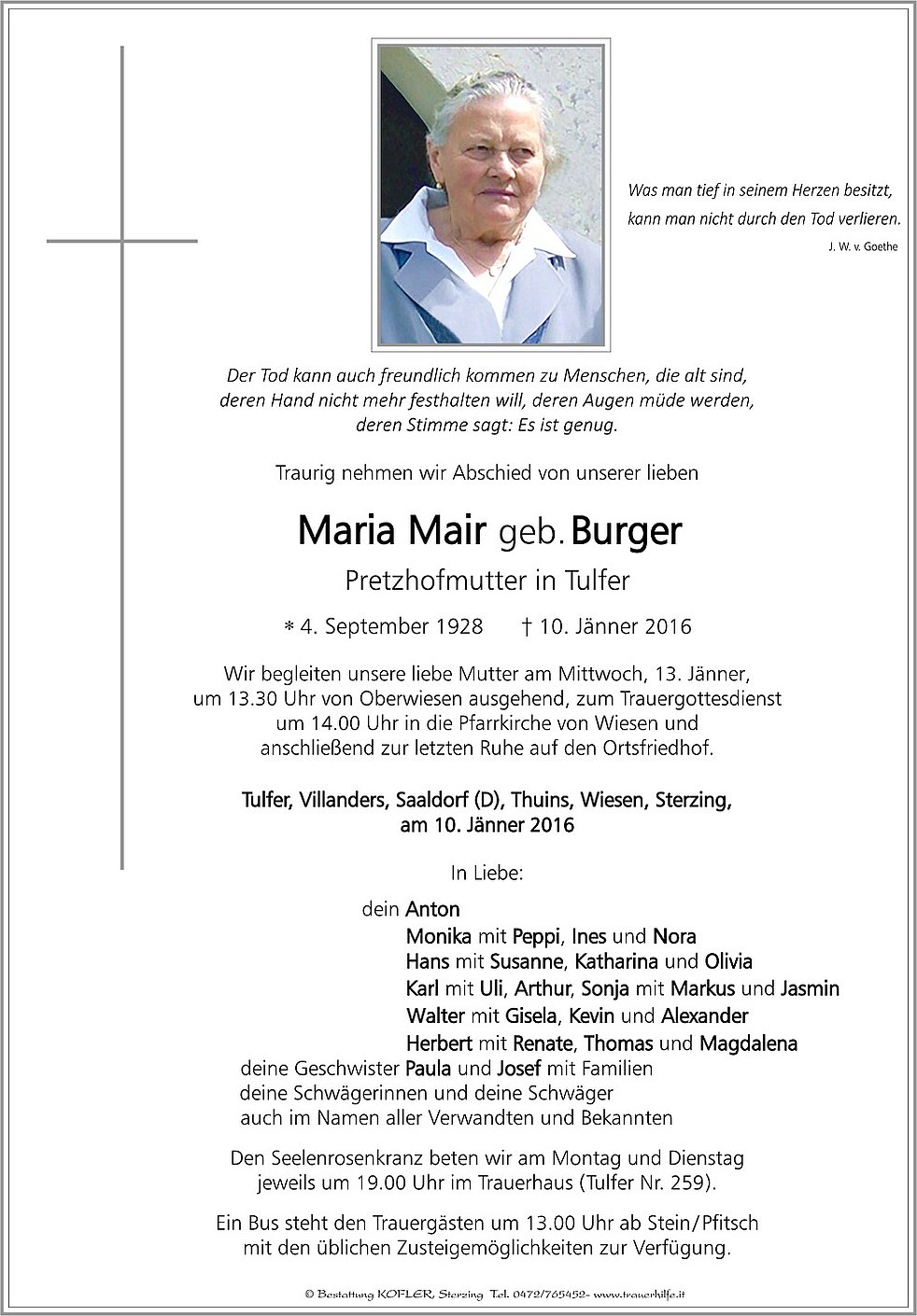 Wir begleiten unsere liebe Mutter am Mittwoch, 13. Jänner, um 13.30 Uhr von Oberwiesen ausgehend, zum Trauergottesdienst um 14.00 Uhr in die Pfarrkirche von Wiesen und anschließend zur letzten Ruhe auf den Ortsfriedhof.
