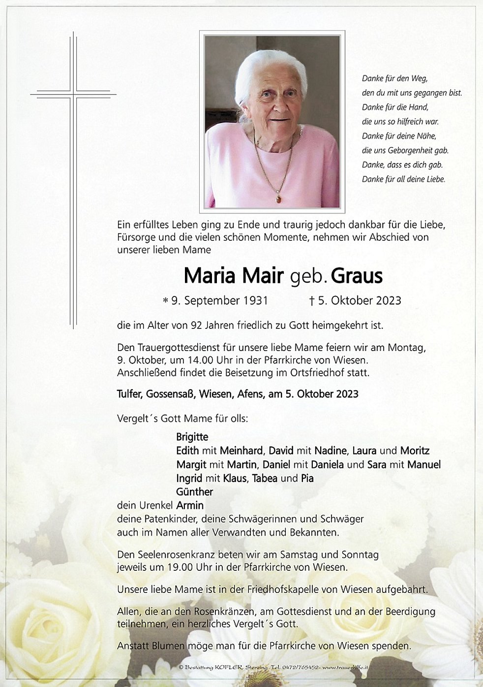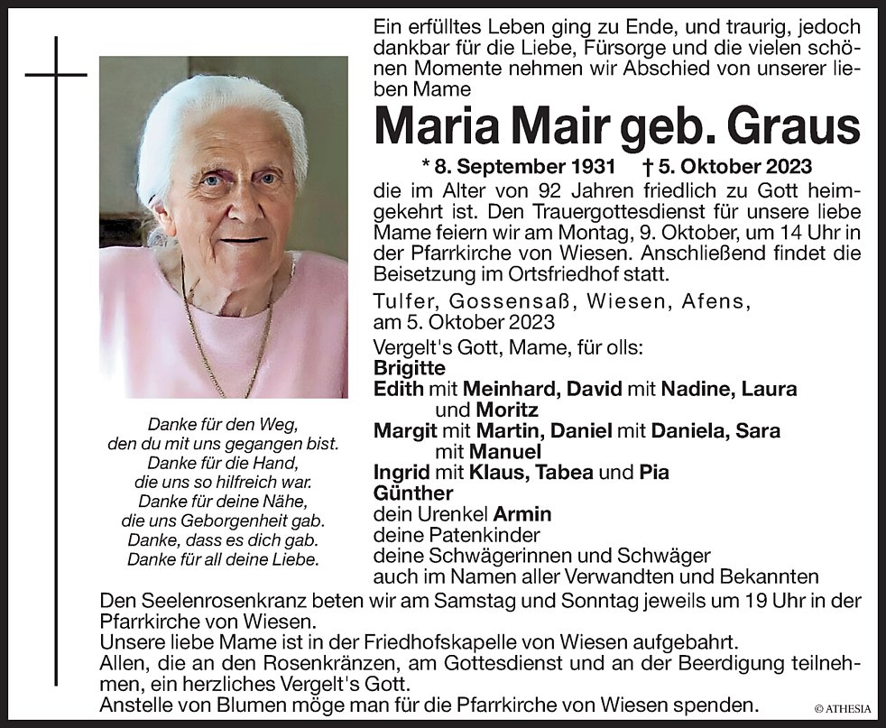Den Trauergottesdienst für unsere liebe Mame feiern wir am Montag, 9. Oktober, um 14.00 Uhr in der Pfarrkirche von Wiesen. Anschließend findet die Beisetzung im Ortsfriedhof statt.