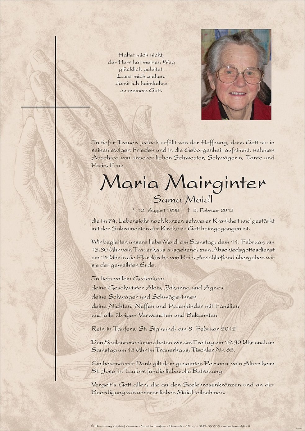 Wir begleiten unsere liebe Moidl am Samstag, dem 11. Februar, um 13.30 Uhr vom Trauerhaus ausgehend, zum Abschiedsgottesdienst um 14 Uhr in die Pfarrkirche von Rein. Anschließend übergeben wir sie der geweihten Erde.