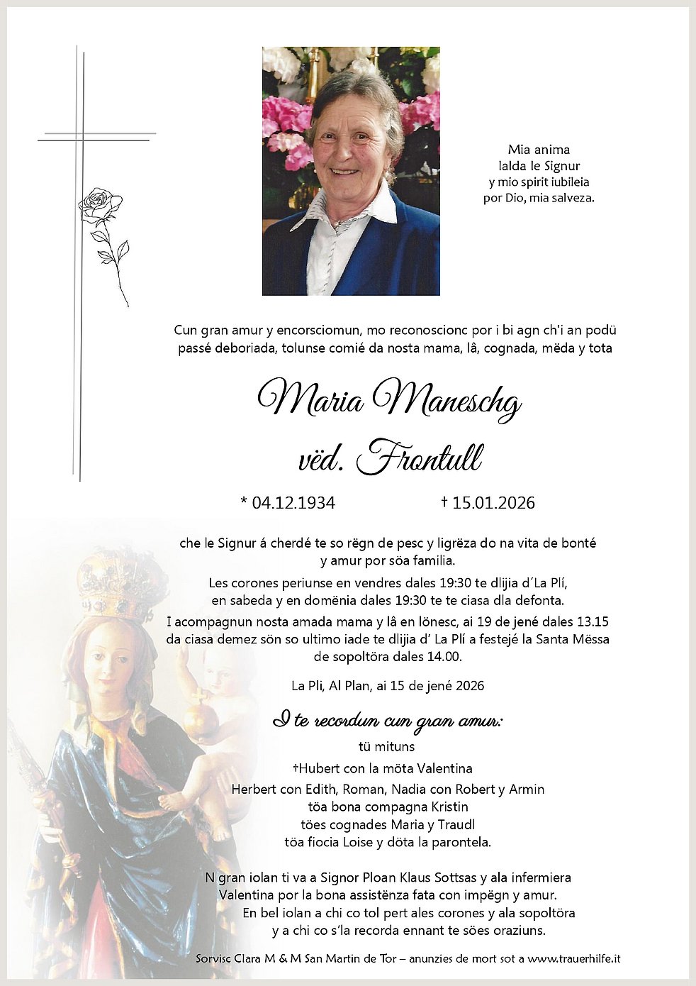 Begräbnisgottesdienst: 19.01. - 14:00 Uhr Enneberg Pfarre