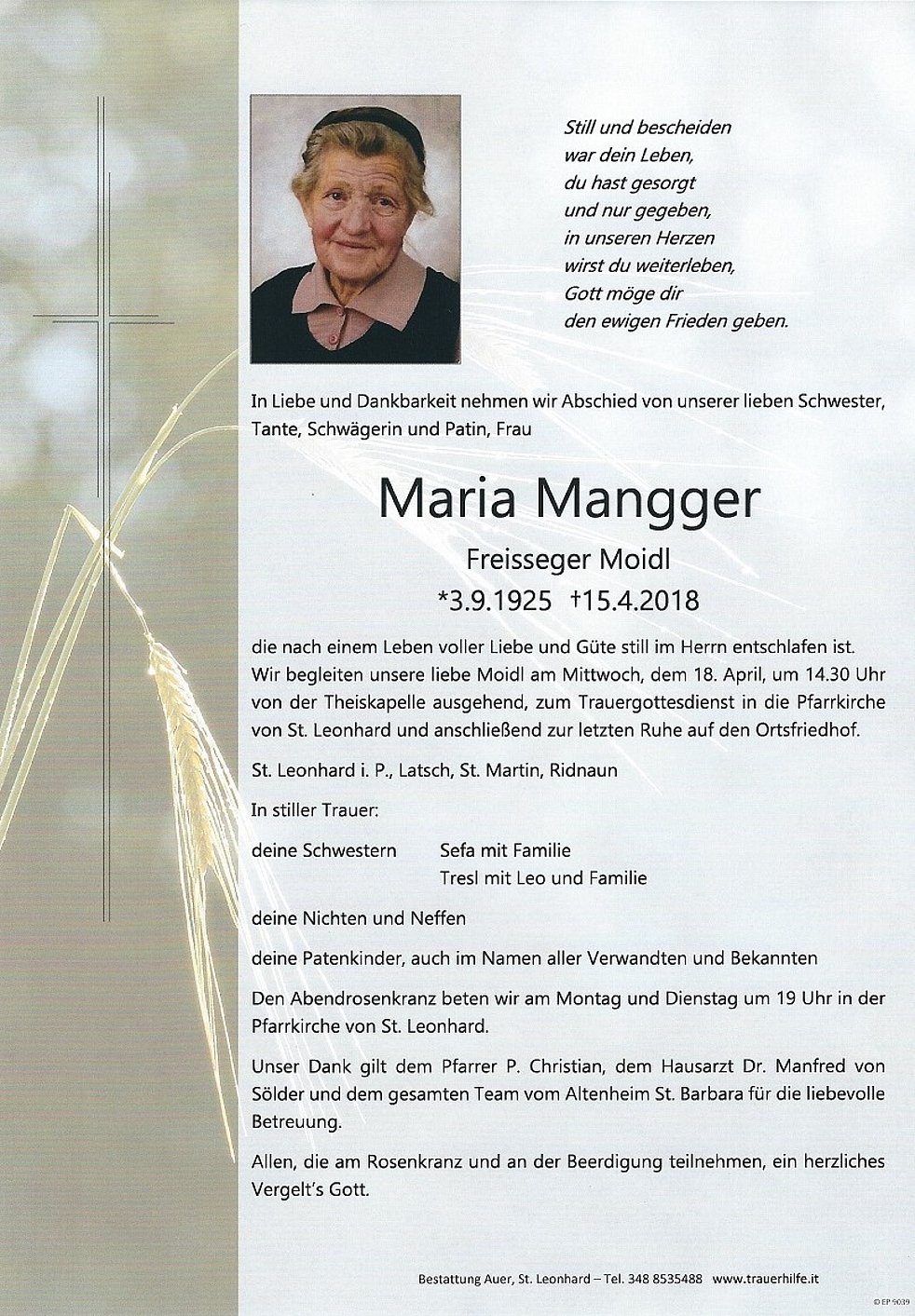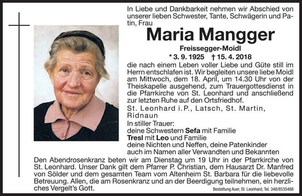 Wir begleiten unsere liebe Moidl am Mittwoch, dem 18. April, um 14.30 Uhr von der Theiskapelle ausgehend, zum Trauergottesdienst in die Pfarrkirche von St. Leonhard und anschließend zur letzten Ruhe auf den Ortsfriedhof.