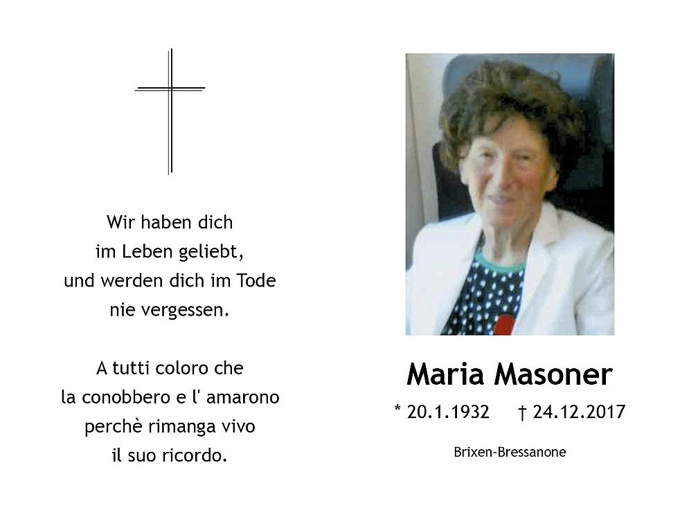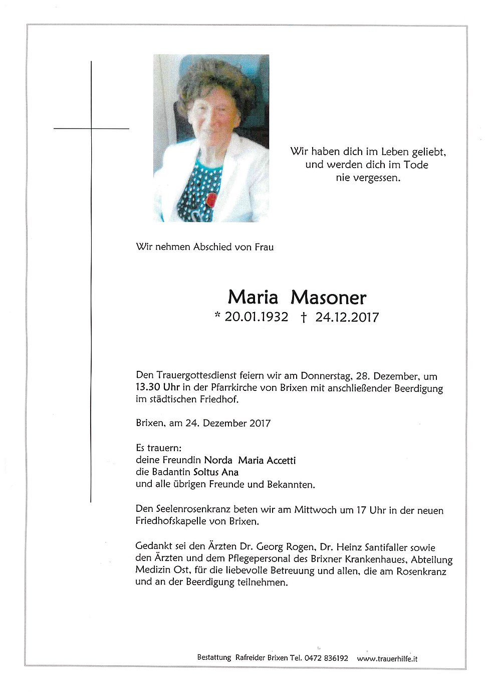 Gedankt sei den Ärzten Dr. Georg Rogen, Dr. Heinz Santifaller sowie den Ärzten und dem Pflegepersonal des Brixner Krankenhaues, Abteilung Medizin Ost, für die liebevolle Betreuung und allen, die am Rosenkranz und an der Beerdigung teilnehmen.