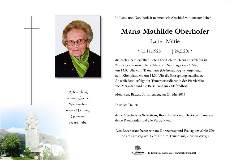 von Meransen und die Beisetzung im Ortsfriedhof.