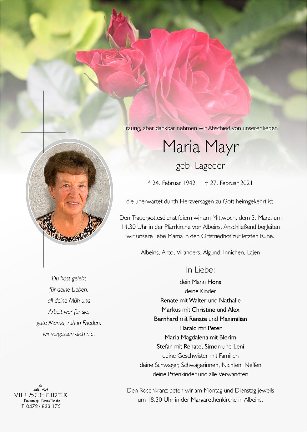 Lieber Bernhard, liebe Kinder, lieber Hans, es ist schwierig die richtigen Worte zu finden...als ich dich liebe Moidl gestern hier unter den Verstorbenen fand, war ich sehr erschrocken, wie dünn der Faden zwischen Leben und Tod sein kann. Ich wünsche dir eine gute Reise, schaue runter auf deine Liebe. Euch allen ganz viel Kraft und Zuversicht mein herzlichstes Beileid Fam. Renate Hilpold