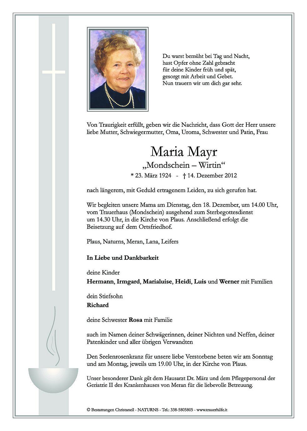 Wir begleiten unsere Mama am Dienstag, den 18. Dezember, um 14.00 Uhr, vom Trauerhaus (Mondschein) ausgehend zum Trauergottesdienst um 14.30 Uhr, in die Kirche von Plaus.