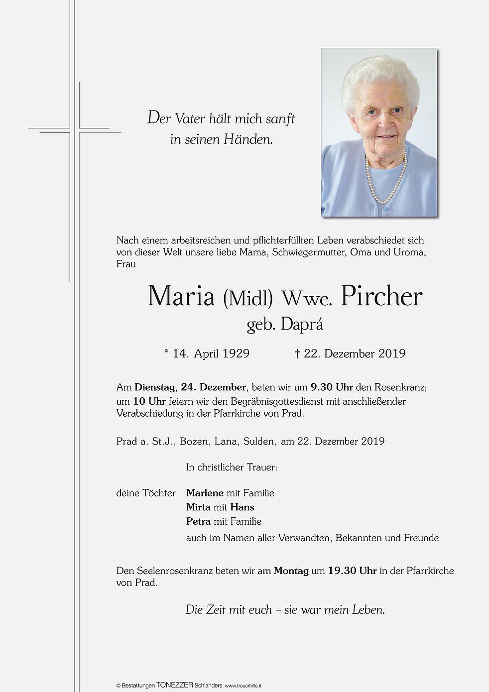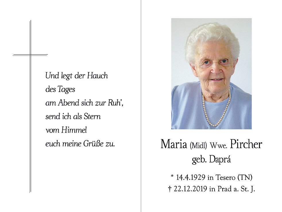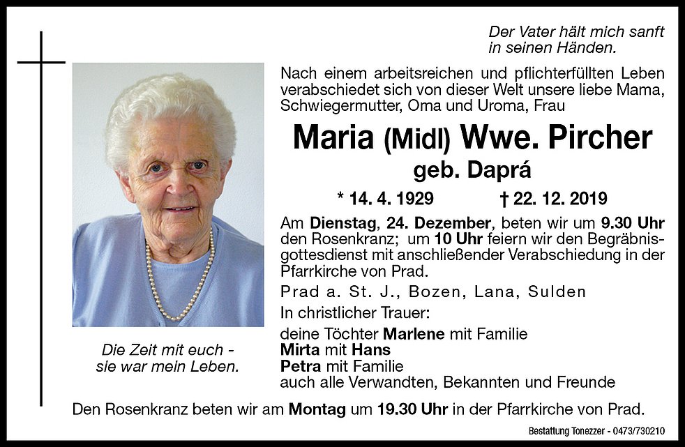 Am Dienstag, 24. Dezember, beten wir um 9.30 Uhr den Rosenkranz; um 10 Uhr feiern wir den Begräbnisgottesdienst mit anschließender Verabschiedung in der Pfarrkirche von Prad.