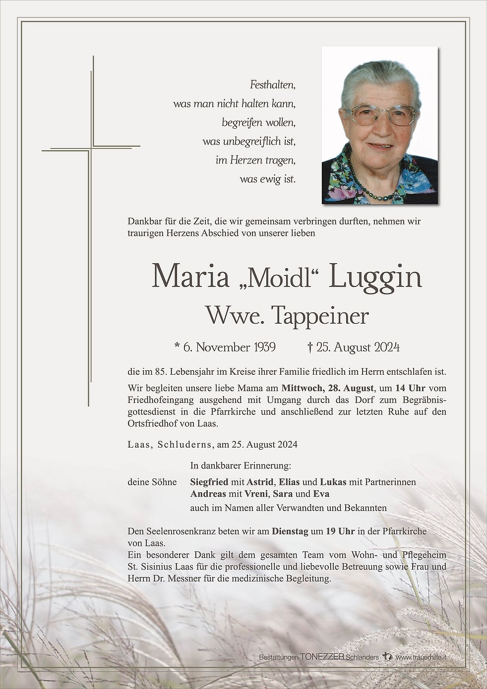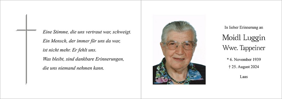 Begräbnisgottesdienst: 28.08. - 14:00 Uhr Pfarrkirche von Laas