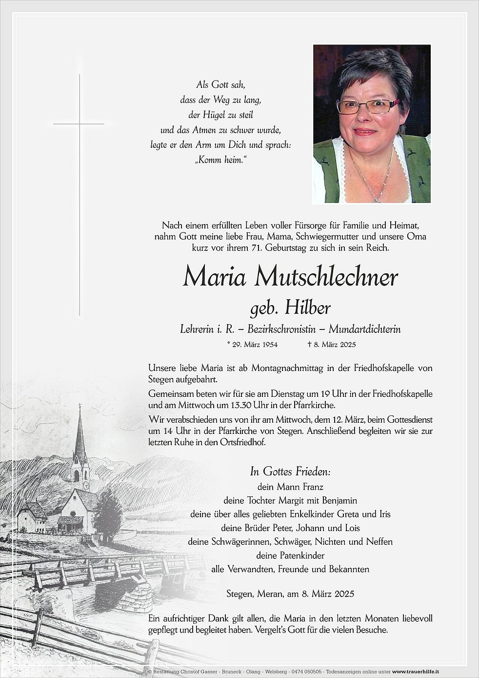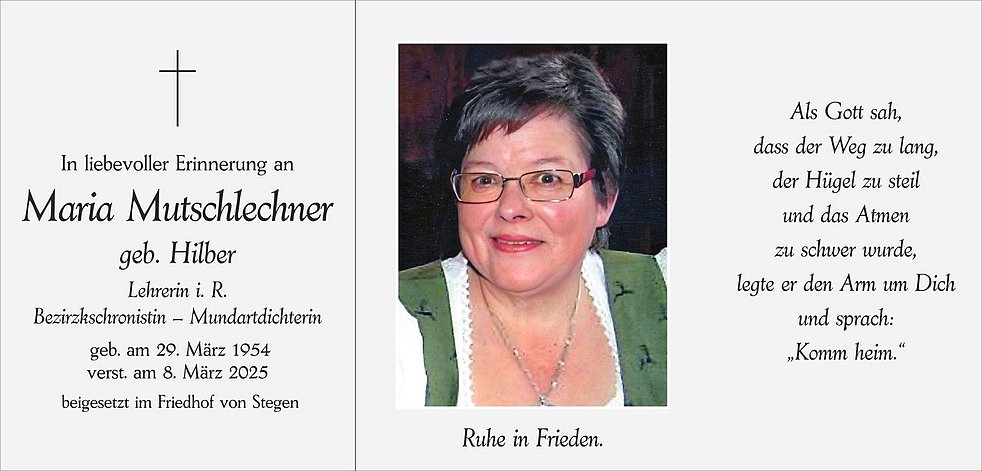 Ein aufrichtiger Dank gilt allen, die Maria in den letzten Monaten liebevoll gepflegt und begleitet haben. Vergelt’s Gott für die vielen Besuche.