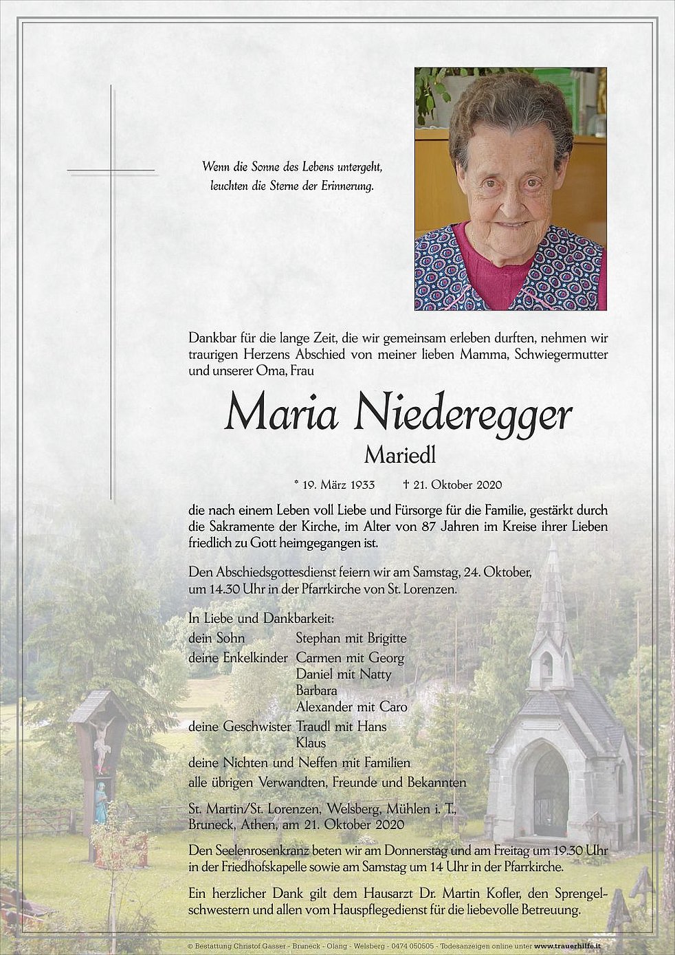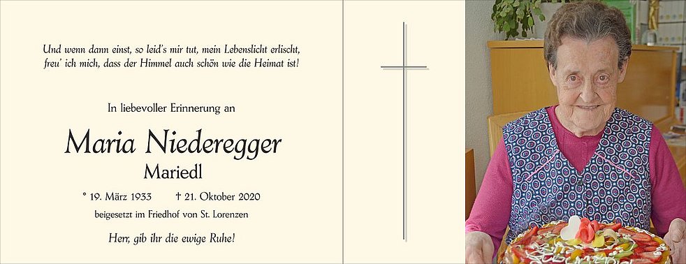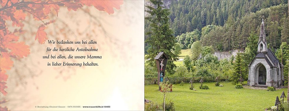 Ein herzlicher Dank gilt dem Hausarzt Dr. Martin Kofler, den Sprengel-schwestern und allen vom Hauspflegedienst für die liebevolle Betreuung.