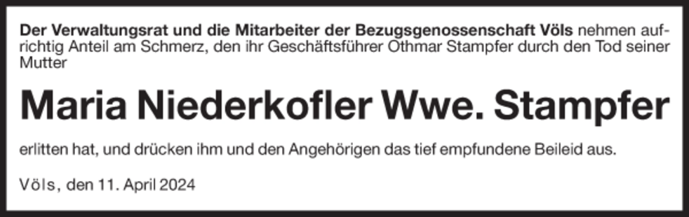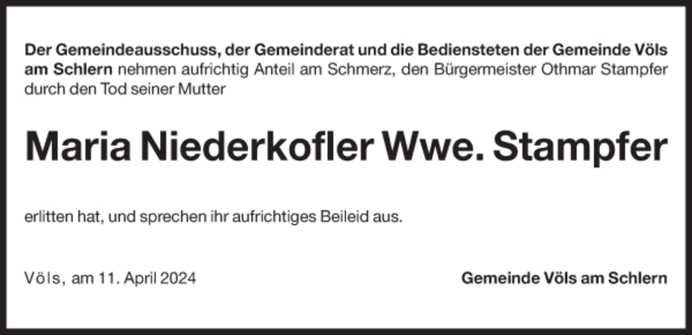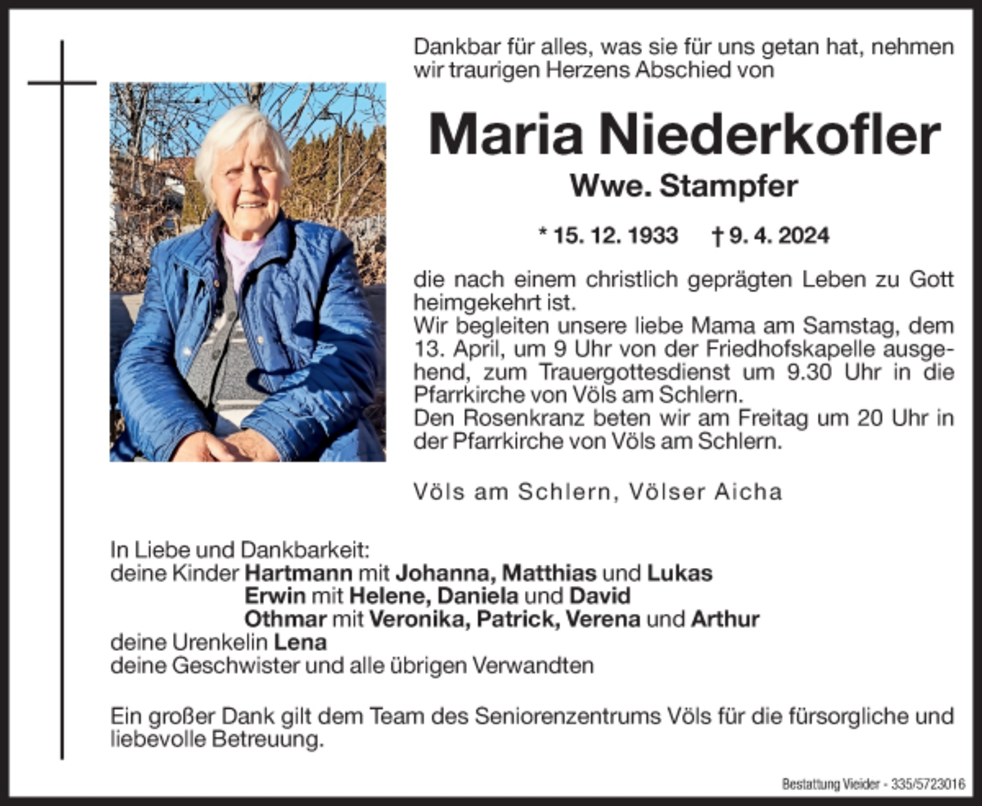 Wir begleiten unsere liebe Mama am Samstag, dem 13. April, um 9 Uhr von der Friedhofskapelle ausgehend, zum Trauergottesdienst um 9.30 Uhr in die Pfarrkirche von Völs am Schlern.