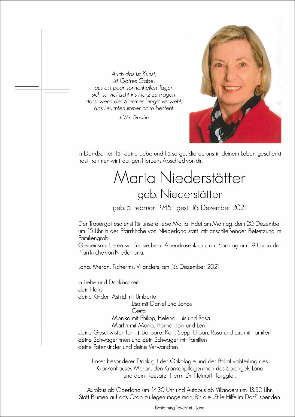 Unser aufrichtiges Mitgefühl am Heimgang deiner lieben Maria, eurer lieben Mutter möchten wir auf diesem Weg entbieten, viel Stärke in dieser schweren Zeit wünschen wir euch von ganzen Herzen,Fam.Gasser (Peter) aus Villanders