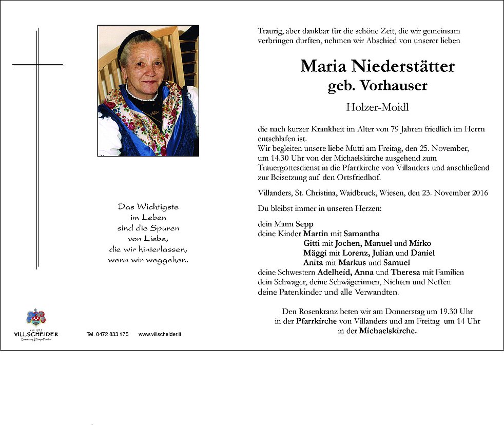 um 14.30 Uhr von der Michaelskirche ausgehend zum Trauergottesdienst in die Pfarrkirche von Villanders und anschließend zur Beisetzung auf den Ortsfriedhof.