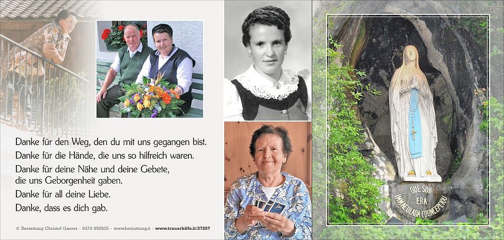 Gemeinsam begleiten wir unsere liebe Mamme am Dienstag, 28. November, um 13.15 Uhr vom Trauerhaus ausgehend, zum Abschiedsgottesdienst um 14.30 Uhr in die Pfarrkirche von Taufers und anschließend zur Beisetzung in den Ortsfriedhof.