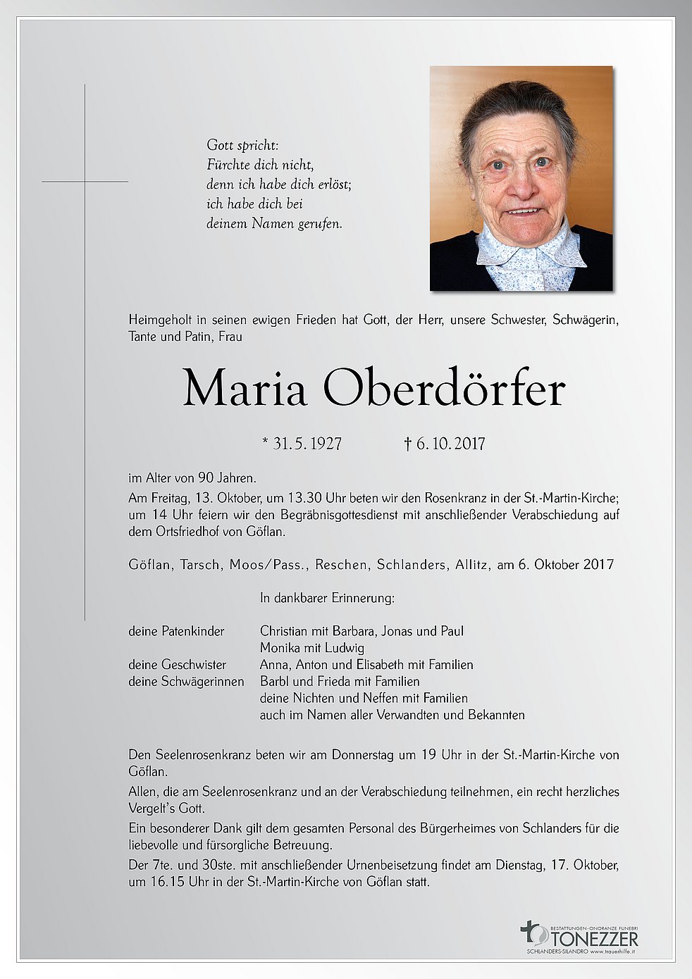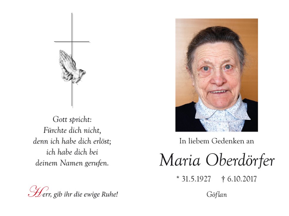 Der 7te. und 30ste. mit anschließender Urnenbeisetzung findet am Dienstag, 17. Oktober, um 16.15 Uhr in der St.-Martin-Kirche von Göflan statt.
