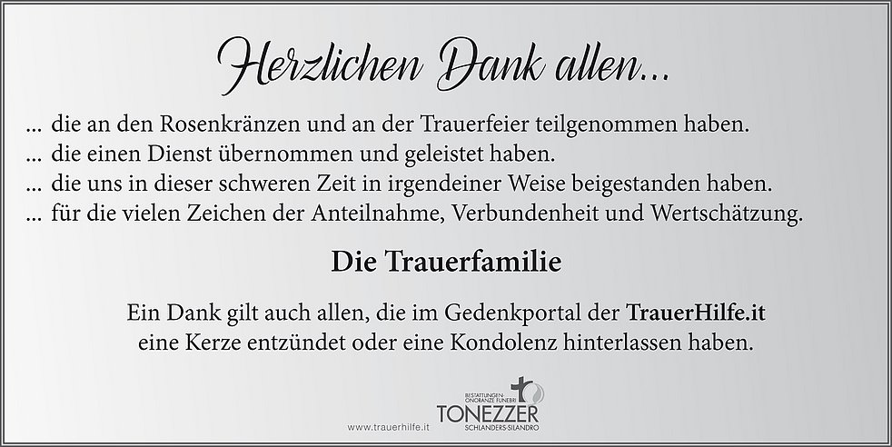 Ein besonderer Dank gilt dem gesamten Personal des Bürgerheimes von Schlanders für die liebevolle und fürsorgliche Betreuung.