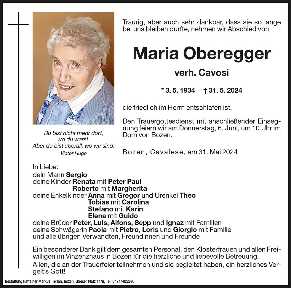 Den Trauergottesdienst mit anschließender Einsegnung feiern wir am Donnerstag, 6. Juni, um 10 Uhr im Dom von Bozen.