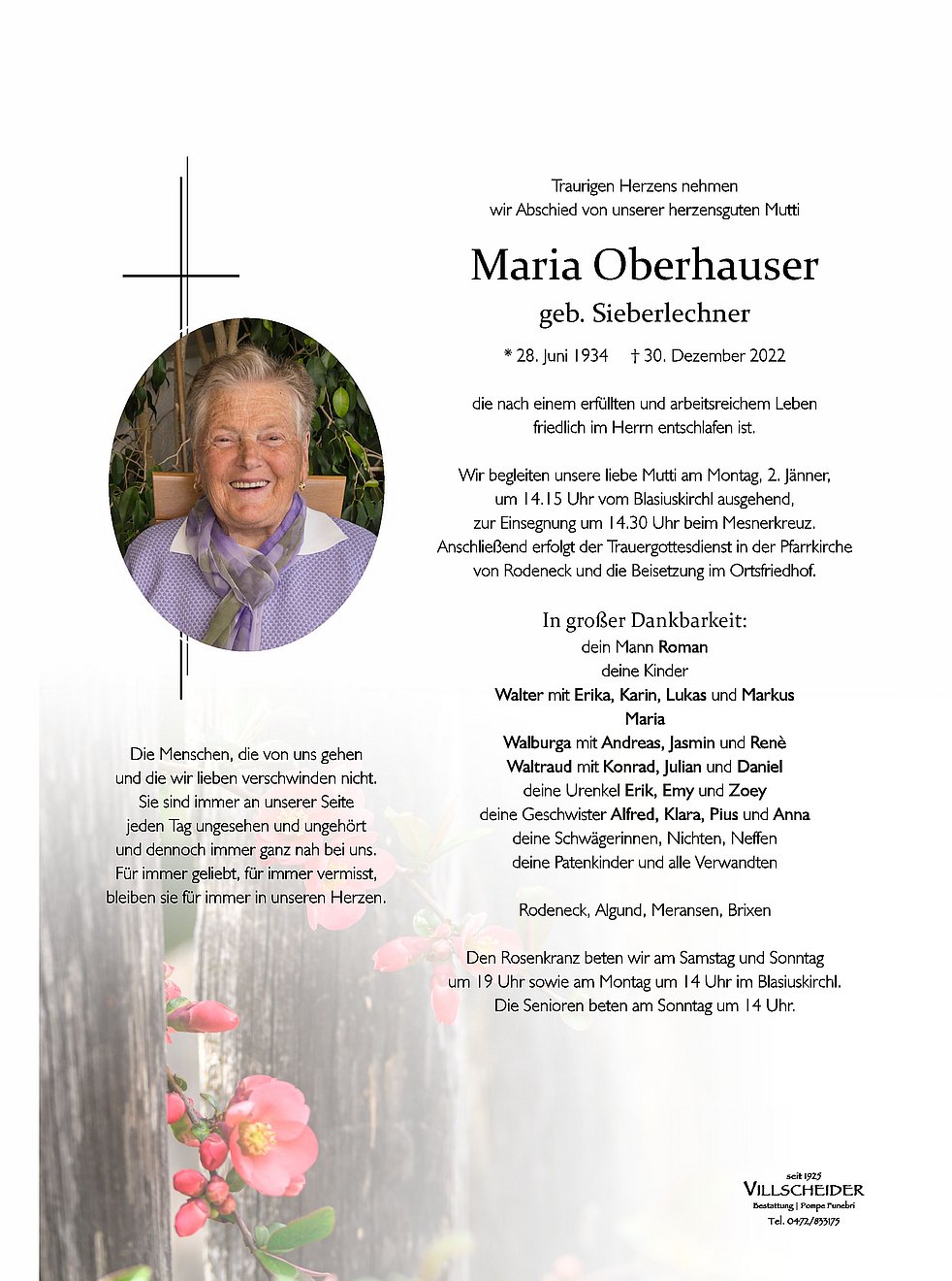 Liebe Trauerfamilien, unser herzliches Beileid anlässlich des Ablebens eurer lieben Mutti! Möge der Herr sie nun aufnehmen in die ewige Heimat und euch Zuversicht und Trost spenden!