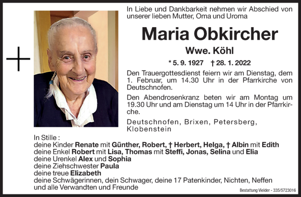 Den Trauergottesdienst feiern wir am Dienstag, dem 1. Februar, um 14.30 Uhr in der Pfarrkirche von Deutschnofen .