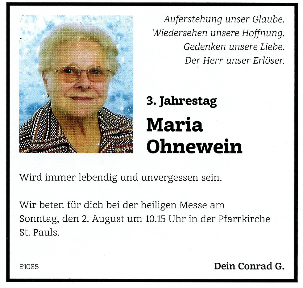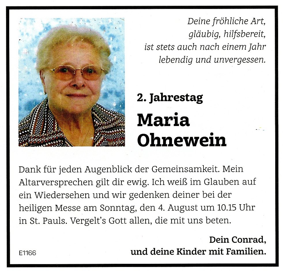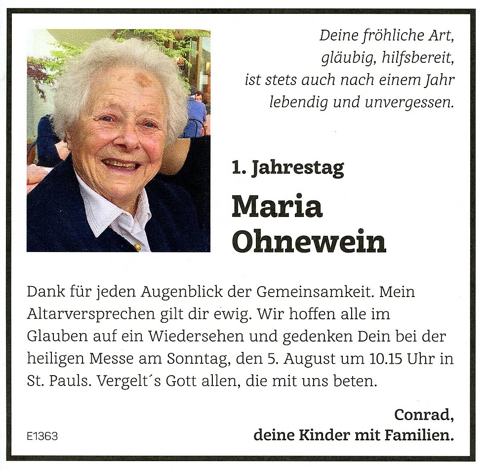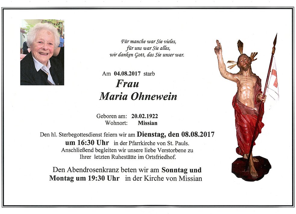 Den Trauergottesdienst feiern wir am Dienstag, dem 8. August um 16.30 Uhr in der Pfarrkirche von St. Pauls. Anschließend begleiten wir unsere liebe Verstorbene auf den Ortsfriedhof.