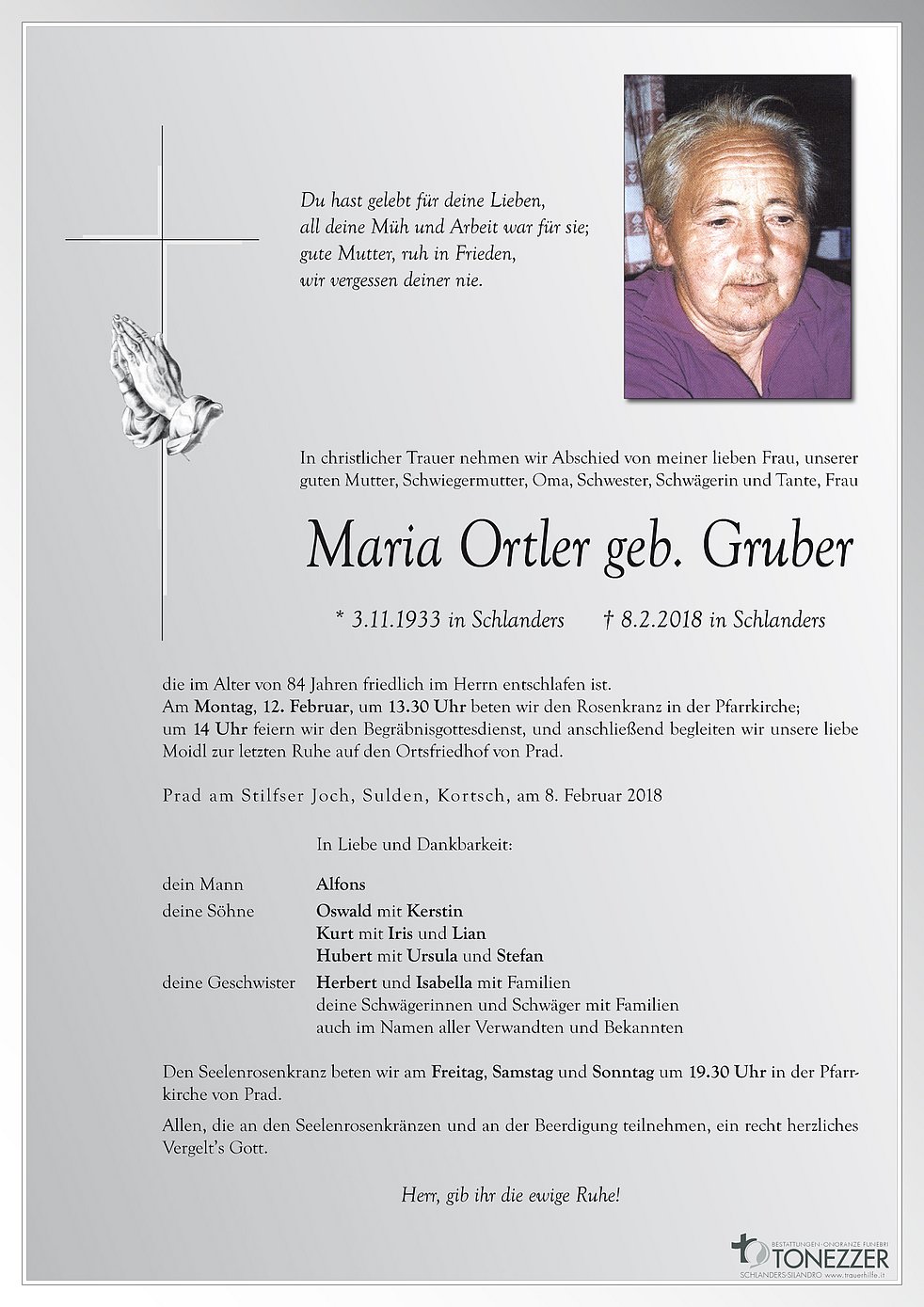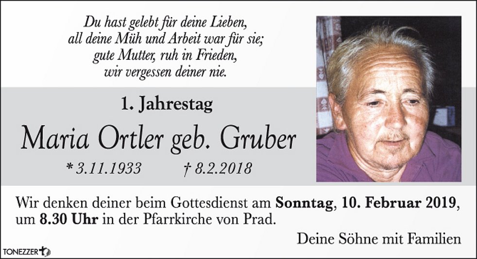 Am Montag, 12. Februar, um 13.30 Uhr beten wir den Rosenkranz in der Pfarrkirche; um 14 Uhr feiern wir den Begräbnisgottesdienst, und anschließend begleiten wir unsere liebe Moidl zur letzten Ruhe auf den Ortsfriedhof von Prad.